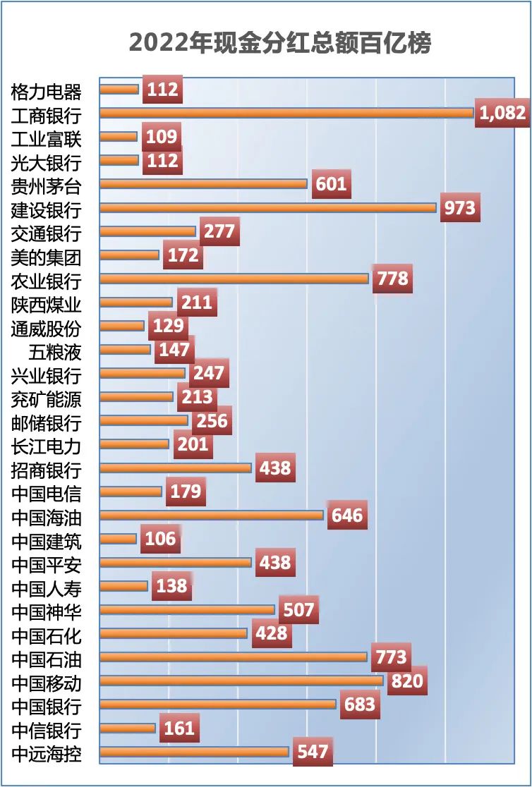 統(tǒng)計顯示,在已經披露分紅方案的3441家公司中,有29家公司2022年度現(xiàn)金分紅將超過100億元。