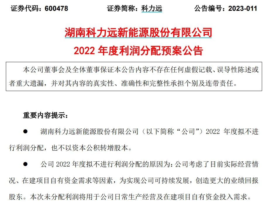 雖然各項成績優(yōu)秀,但科力遠表示,鑒于公司在2023年有重大投資計劃或重大現(xiàn)金支出等事項發(fā)生,公司對于2022年度利潤不進行分配。