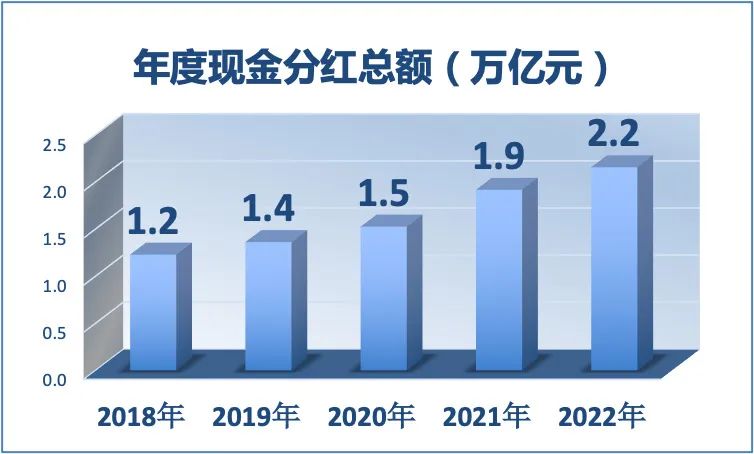 數(shù)據(jù)顯示,2018年至2021年,A股上市公司累計現(xiàn)金分紅總額分別為1.2萬億元、1.4萬億元、1.5萬億元、1.9萬億元。2022年分紅總金額突破2萬億元,再上新臺階。