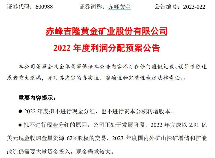 例如,赤峰黃金公告稱,公司2022年度合并報表實現(xiàn)歸母凈利潤為4.51億元,母公司實現(xiàn)凈利潤為5.07億元,未分配利潤近12億元,且期末賬上有超10億元現(xiàn)金。