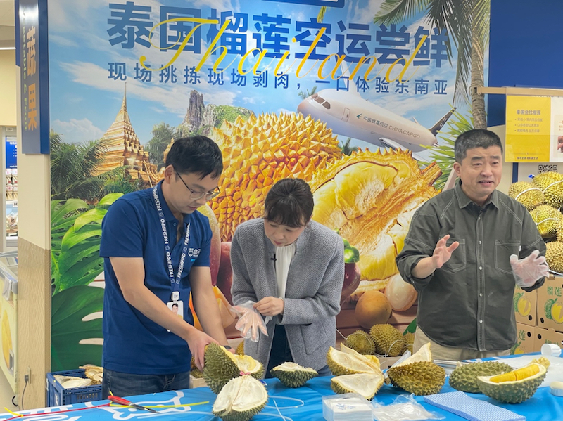 不久之前,盒馬的生鮮買手帶著新鮮的泰國(guó)貓山王榴蓮登陸東方衛(wèi)視的“五五購(gòu)物節(jié)”全球大直播,給國(guó)內(nèi)消費(fèi)者介紹如何挑選榴蓮。