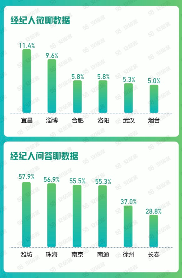 此外,58同城、安居客通過統(tǒng)計(jì)微聊問答數(shù)據(jù)發(fā)現(xiàn),宜昌、淄博、合肥、洛陽、武漢、煙臺等城市購房者向經(jīng)紀(jì)人的咨詢量增多;濰坊、珠海、南京、南通、徐州、長春等城市經(jīng)紀(jì)人回答購房者問題增多。