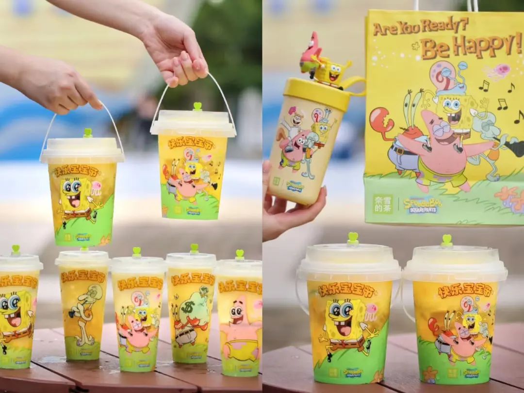 5月29日,奈雪官宣與海綿寶寶發(fā)起“快樂寶寶節(jié)”,購(gòu)買生椰鳳梨新品,就能獲得IP聯(lián)名保溫杯、貼紙、手提袋、音樂泡泡機(jī)等周邊。
