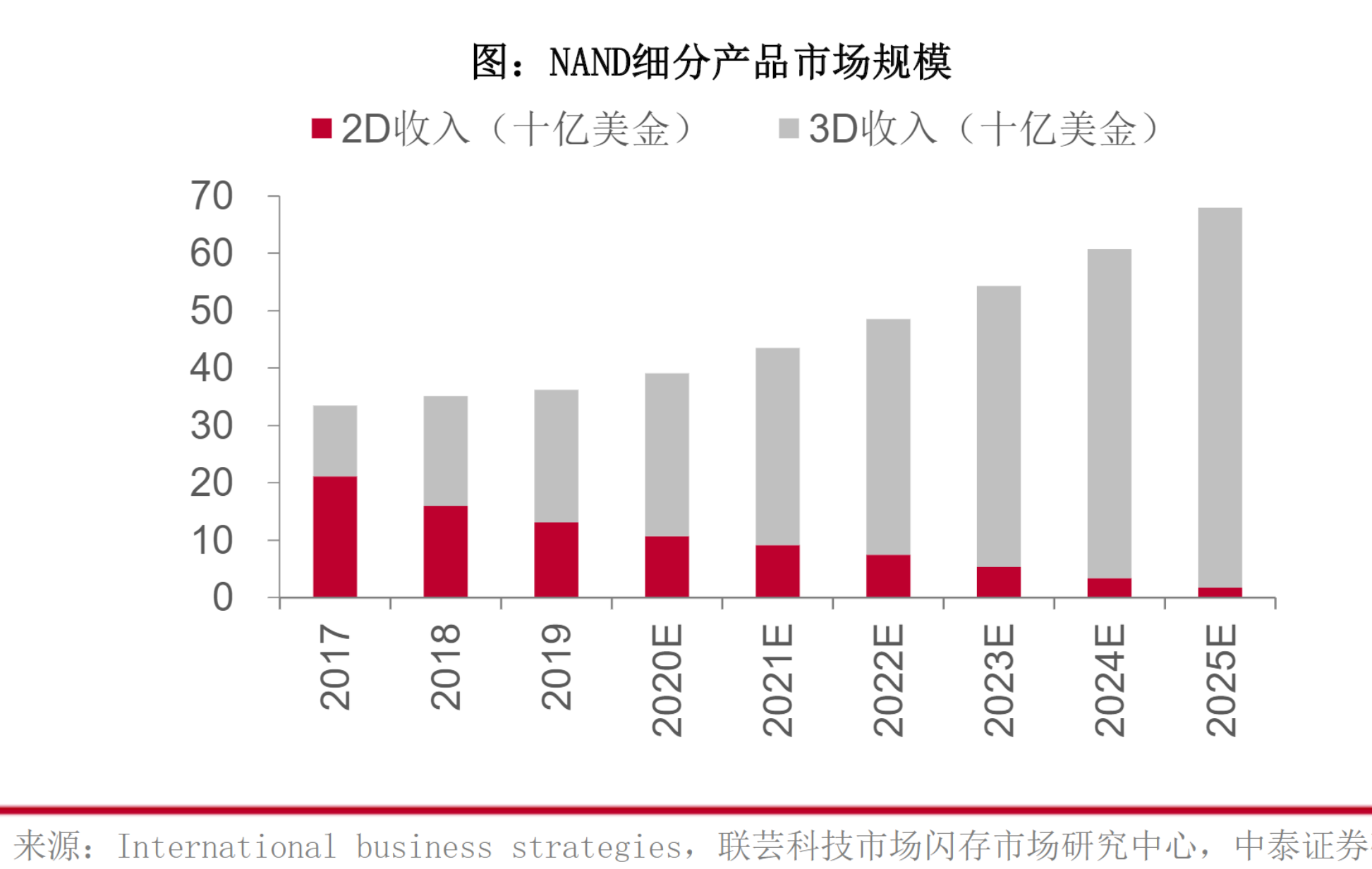 中泰證券分析師王芳等5月22日發(fā)布的研報指出,2D到3D大勢所趨。2019年,3D NAND的滲透率為72.6%,已遠超2D NAND,且未來仍將持續(xù)提高,預(yù)計2025年3D NAND將占閃存總市場的97.5%。