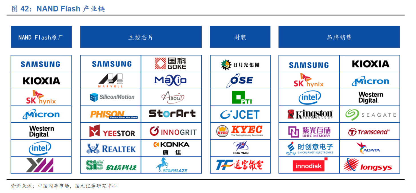 國元證券指出,NAND Flash的產(chǎn)業(yè)鏈分為NAND Flash原廠顆粒、主控芯片設(shè)計、封裝工廠與品牌銷售。各產(chǎn)業(yè)鏈環(huán)節(jié)中,封裝企業(yè)與半導(dǎo)體封測企業(yè)有較大的重合,如日月光、長電科技、華天科技、通富微電等,我國在半導(dǎo)體封測領(lǐng)域處于國際上的第一梯隊,因此在NAND Flash存儲的封裝領(lǐng)域表現(xiàn)也較為優(yōu)異。