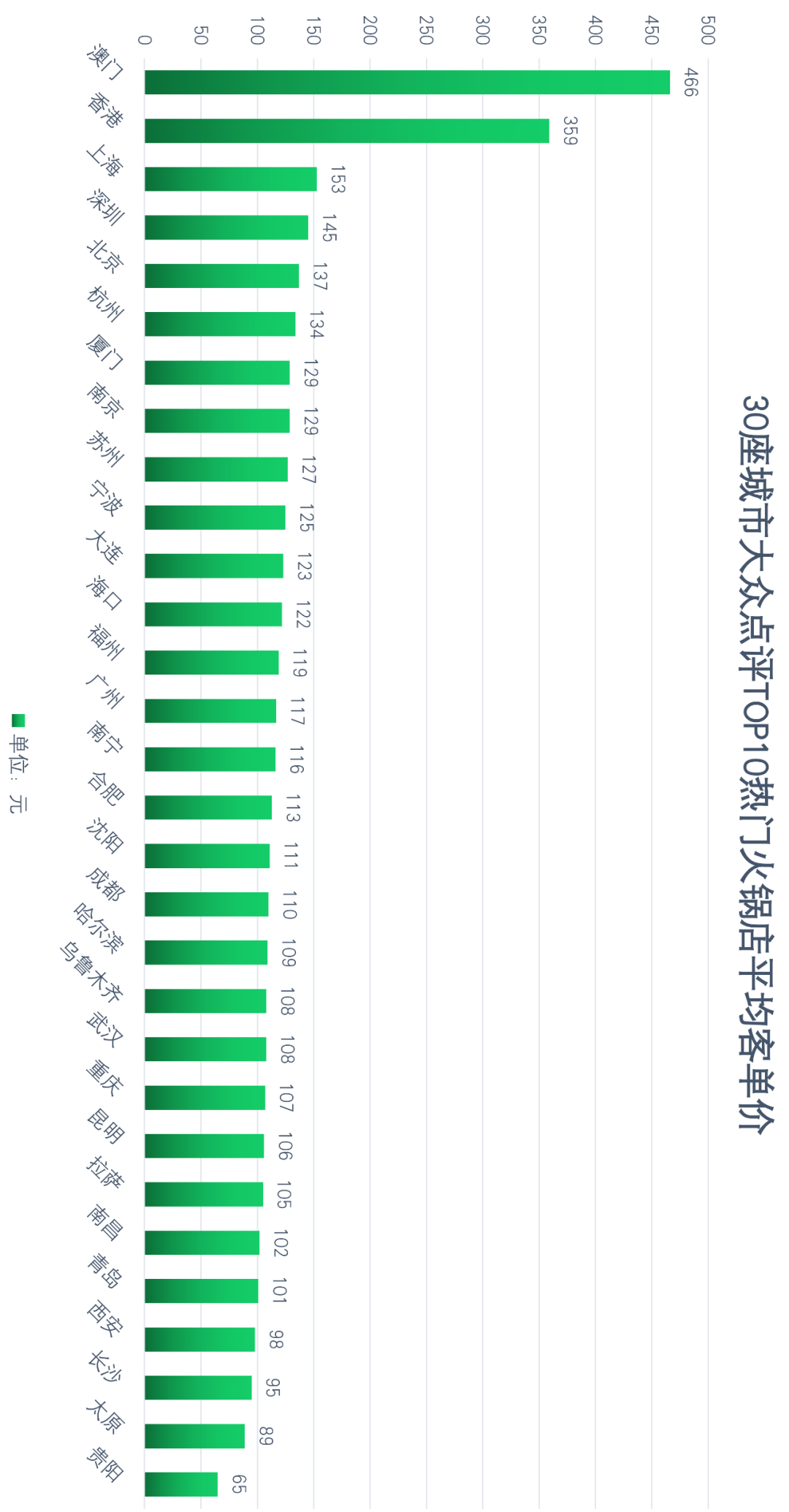 從30座城市大眾點(diǎn)評(píng)TOP10熱門火鍋店的平均客單價(jià)來(lái)看,澳門以466.2元拔得頭籌,香港緊隨其后(358.9元),可見以海鮮為主食材的火鍋消費(fèi)水平明顯高于其他;
