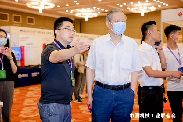 圖:賽博昆侖工作人員為中國機械工業(yè)聯(lián)合會常務(wù)副會長張克林介紹產(chǎn)品