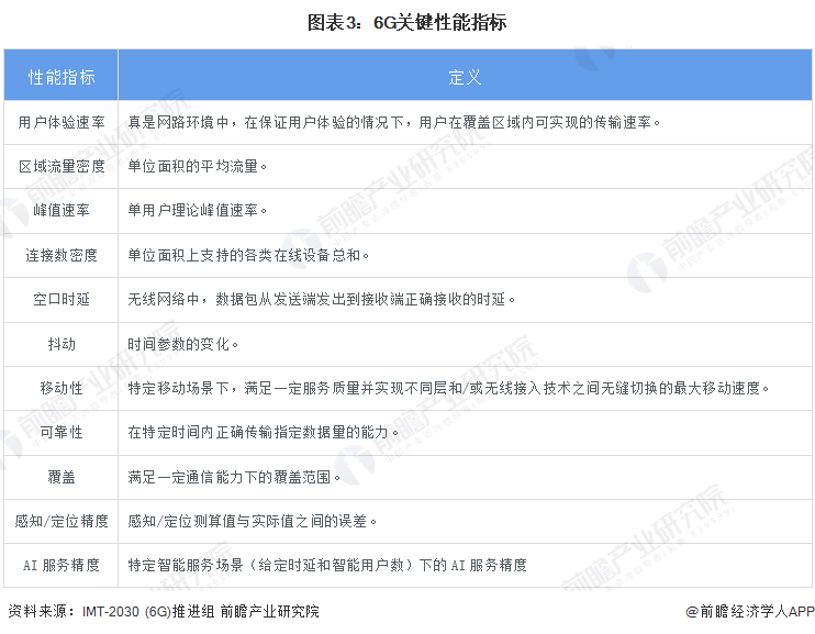 根據(jù)IMT-2030 (6G)推進(jìn)組發(fā)布的《6G典型場景和關(guān)鍵能力》白皮書,6G關(guān)鍵性能指標(biāo)有用戶體驗速率、區(qū)域流量密度、峰值速率、連接數(shù)密度、空口時延、抖動、移動性、可靠性、覆蓋、感知/定位精度、AI服務(wù)精度。