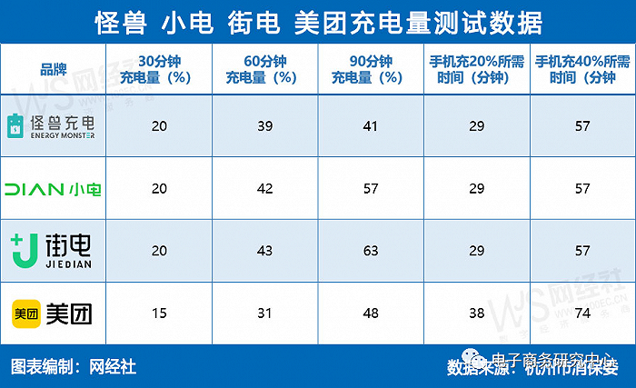 在杭州消保委測(cè)評(píng)結(jié)果中,當(dāng)充電30分鐘后,基本上都能達(dá)到20%的電量,而美團(tuán)的充電量較差低于其他三個(gè)品牌;當(dāng)充電60分鐘后,街電的充電量最高,可充到43%的電量,其次是小電(42%)、怪獸(39%),相比之下,美團(tuán)僅充了31%;當(dāng)充電90分鐘后,街電的充電量依舊最高達(dá)到63%,其次是小電(57%)、美團(tuán)(48%),而怪獸充電90分鐘才能充41%的電量。