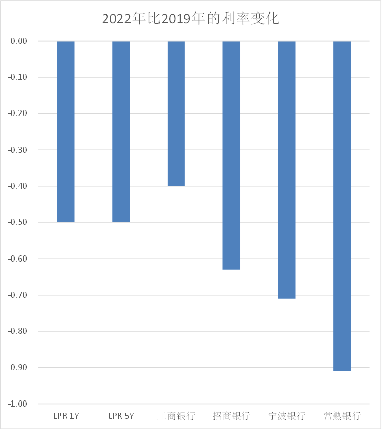 我們以工商銀行、招商銀行、寧波銀行、常熟銀行財(cái)報(bào)披露的貸款平均利率(上圖中分別是上半年的平均利率和全年的平均利率)為例,可以發(fā)現(xiàn):工商銀行、招商銀行這些大型銀行,其貸款利率的下降滯后于LPR變化,但幅度相近,因此LPR下降是帶動(dòng)他們利率下降的主因(加點(diǎn)已沒什么可降的了)。而寧波銀行、常熟銀行的貸款利率則下降幅度很大,LPR降幅可能只能解釋其一半多,另一小半就是收回重貸時(shí)加點(diǎn)的下降,即來自貸款競爭加劇的影響。