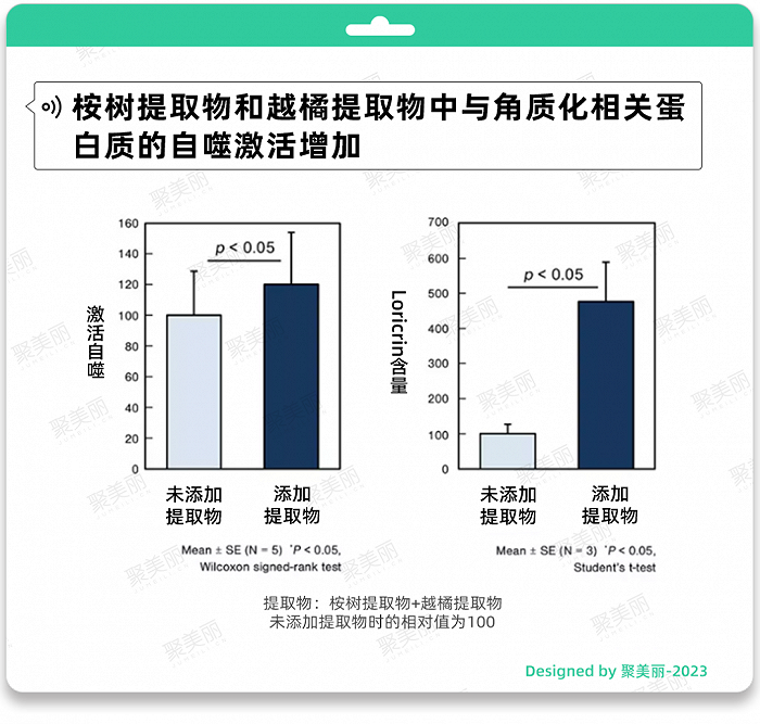 通過(guò)對(duì)200多種護(hù)膚活性成分的篩選,花王發(fā)現(xiàn),同時(shí)使用桉樹(shù)提取物和越橘提取物時(shí),細(xì)胞自噬活性增加,角化相關(guān)蛋白的量增加,結(jié)果如下圖所示。因此,桉樹(shù)提取物和越橘提取物的組合具有調(diào)節(jié)角質(zhì)化的能力。