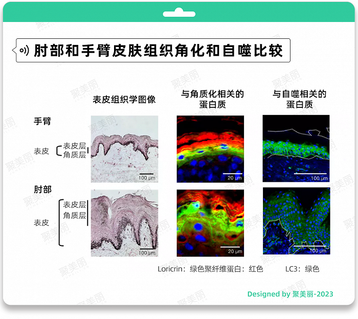 而且,LC3作為一種用于通量測(cè)定細(xì)胞自噬活性的蛋白質(zhì)標(biāo)志物,其在肘部皮膚的代謝率低于手臂皮膚,即肘部的細(xì)胞自噬活性明顯降低。這表明,較低的自噬活性可能是角質(zhì)化障礙的原因之一。
