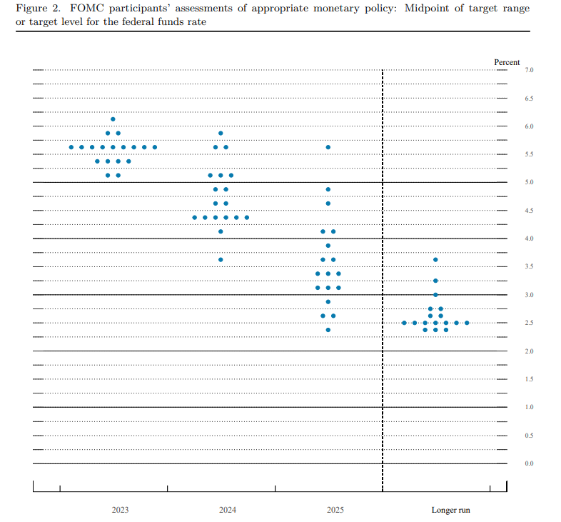 對于“終值利率”的問題,鮑威爾也明確重申,他個人的觀點(diǎn)與本月公布的經(jīng)濟(jì)預(yù)期一致。在最新的點(diǎn)陣圖中,F(xiàn)OMC委員對2023年政策利率的中值預(yù)期是5.6%,約等于還有兩次25基點(diǎn)的加息。