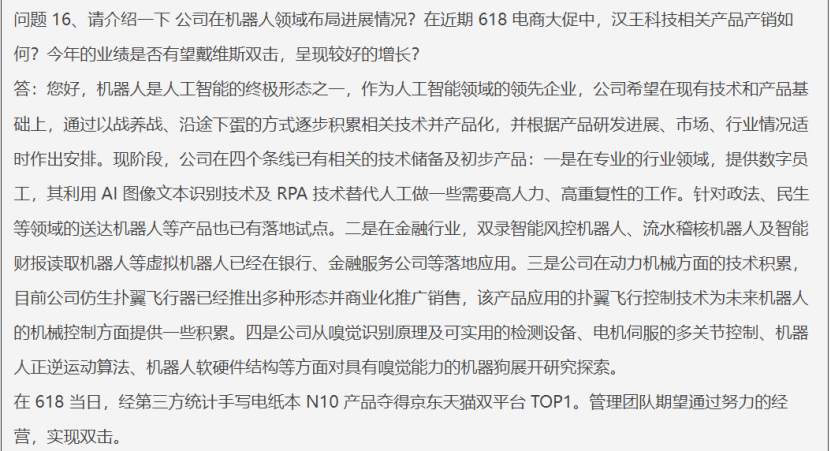 此外,AI人氣股漢王科技也在周二晚間發(fā)布機構(gòu)調(diào)研紀要提及機器人領(lǐng)域布局情況。公司表示,機器人是人工智能的終極形態(tài)之一,現(xiàn)階段,公司在四個條線已有相關(guān)的技術(shù)儲備及初步產(chǎn)品。其中,仿生撲翼飛行器已經(jīng)推出多種形態(tài)并商業(yè)化推廣銷售,該產(chǎn)品應用的撲翼飛行控制技術(shù)為未來機器人在機械控制方面提供了一些積累。
