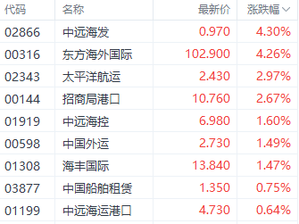 今日港股航運股小幅反彈,截至發(fā)稿,中遠海發(fā)(02866.HK)、東方海外國際(00316.HK)、太平洋航運(02343.HK)分別上漲4.30%、4.26%、2.97%。