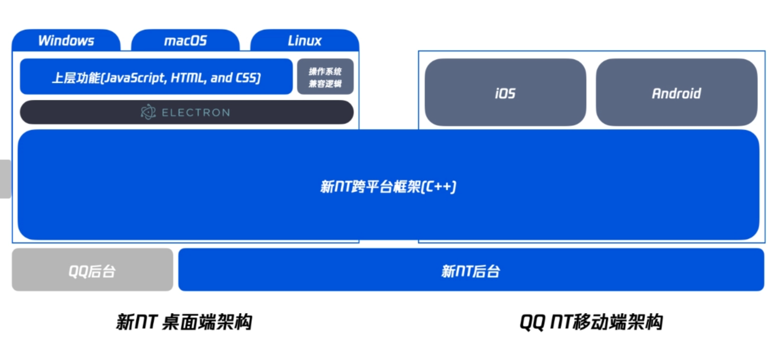 從傳統(tǒng)互聯(lián)網(wǎng)時(shí)代開始,桌面QQ已經(jīng)誕生超過24年。舊版桌面QQ是純Native技術(shù)棧開發(fā)的,經(jīng)過多年迭代,新舊功能邏輯非常復(fù)雜,代碼量非常巨大。出于開發(fā)效率的考慮,新版QQ在技術(shù)選擇和重新配置決策方面,選擇了一套標(biāo)準(zhǔn)化的框架來升級(jí)其整體架構(gòu),即QQ NT架構(gòu)??缙脚_(tái)重用方案可以確保Windows / Mac / Linux三桌面快速、高質(zhì)量迭代,一套代碼多終端操作,統(tǒng)一多平臺(tái)體驗(yàn),滿足桌面用戶需求。近日,基于 NT 架構(gòu)的手機(jī) QQ 首個(gè)正式版也已在發(fā)布中。