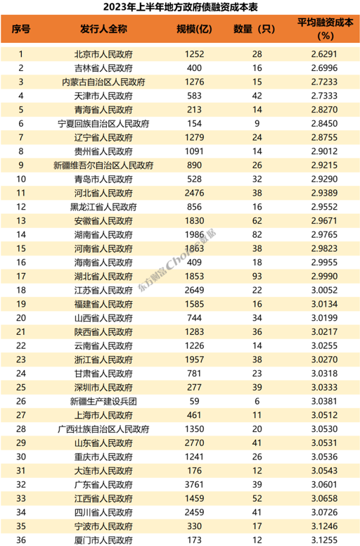根據(jù)Choice數(shù)據(jù)顯示,2023年上半年地方政府債共發(fā)行1066只,發(fā)行金額為43681億,其中,一般地方債發(fā)行金額為15313億元,同比增長(zhǎng)14.99%。從發(fā)行規(guī)模來看,2023年上半年發(fā)行的地方政府債中,專項(xiàng)地方債占比64.94%,同比下滑27.60%。從省份來看,2023年上半年廣東省發(fā)行地方債金額最大,達(dá)3761億元。山東省、江蘇省、河北省及四川省地方債發(fā)行規(guī)模也超2000億元。此外,從融資成本方面來看,全國(guó)19個(gè)地方政府的加權(quán)融資成本高于3%,其中寧波和廈門市融資成本最高,均高于3.1%。