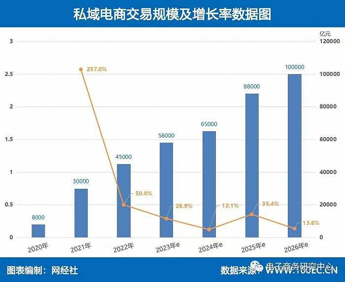 多平臺(tái)、全方位的布局,不僅能拓寬銷售渠道,還能建設(shè)私域流量渠道,減少流量遷移成本。據(jù)悉,目前國內(nèi)知名的私域電商有小紅書、鯨靈集團(tuán)、微盟、有贊、蜂享家、小程序、知乎,B站、快團(tuán)團(tuán)、云集、聚寶贊、微店等。據(jù)“電數(shù)寶”電商大數(shù)據(jù)庫顯示,2020年度小程序電商GMV為8000億元,2021年私域電商整個(gè)市場體量超3萬億元。據(jù)預(yù)測,2026年私域電商交易額將突破10萬億。