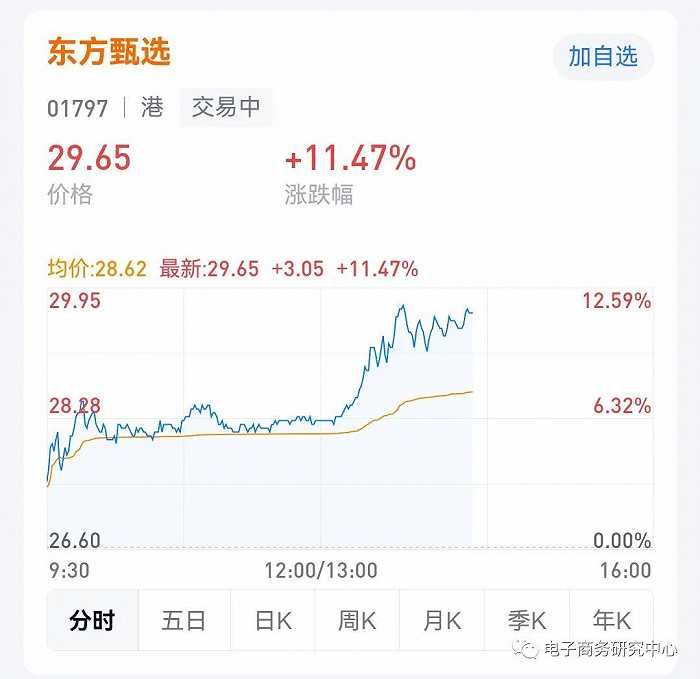 值得注意的是,東方甄選APP上線將近一年,終于要開展直播活動(dòng)了。去年8月24日,東方甄選APP在各大平臺(tái)應(yīng)用商店上線,其以食品為核心,提供一站式購物體驗(yàn)。此消息一出,東方甄選股價(jià)大漲,截至發(fā)稿,東方甄選報(bào)29.65港元/股,漲幅11.47%。