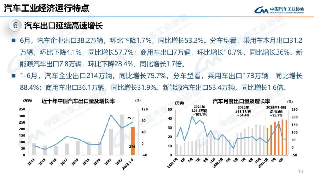 6月,汽車企業(yè)出口38.2萬輛,環(huán)比下降1.7%,同比增長53.2%。其中,新能源汽車出口7.8萬輛,環(huán)比下降28.4%,同比增長1.7倍。1-6月,汽車企業(yè)出口214萬輛,同比增長75.7%。