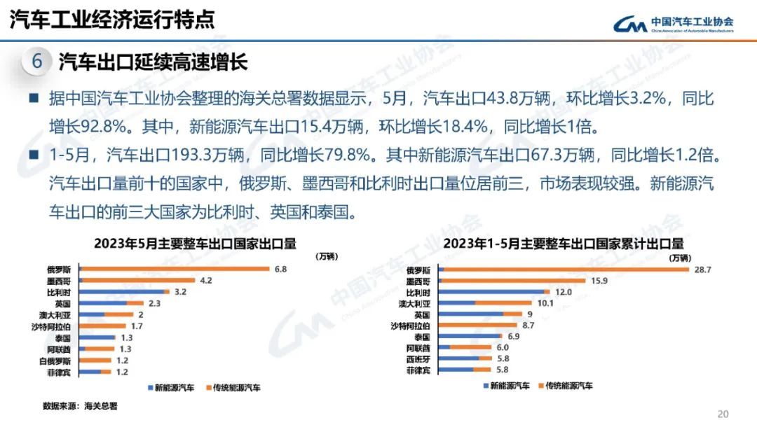 而據(jù)中汽協(xié)整理的海關(guān)總署數(shù)據(jù),5月,汽車出口43.8萬輛,環(huán)比增長3.2%,同比增長92.8%。其中,新能源汽車出口15.4萬輛,環(huán)比增長18.4%,同比增長1倍。1-5月,汽車出口193.3萬輛,同比增長79.8%。其中新能源汽車出口67.3萬輛,同比增長1.2倍。汽車出口量前十的國家中,俄羅斯(28.7萬輛)、墨西哥(15.9萬輛)和比利時(12萬輛)出口量位居前三。新能源汽車出口的前三大國家為比利時、英國和泰國。