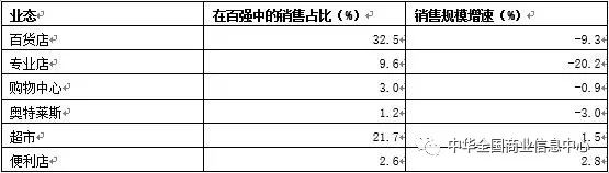 實(shí)體百強(qiáng)零售企業(yè)各業(yè)態(tài)中,百貨店、專業(yè)店、購物中心和奧特萊斯分別占百強(qiáng)銷售規(guī)模的比重為32.5%、9.6%、3.0%和1.2%,同比增速分別下降了9.3%、20.2%、0.9%和3.0%;超市和便利店占百強(qiáng)銷售規(guī)模的比重分別21.7%和2.6%,同比分別增長了1.5和2.8%。