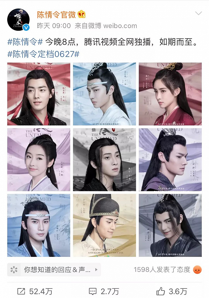 沒(méi)想到次日6月28日,耽改大IP劇《陳情令》也幾乎是空降的,當(dāng)天上午9點(diǎn)定檔、當(dāng)天晚上20點(diǎn)就開(kāi)播。