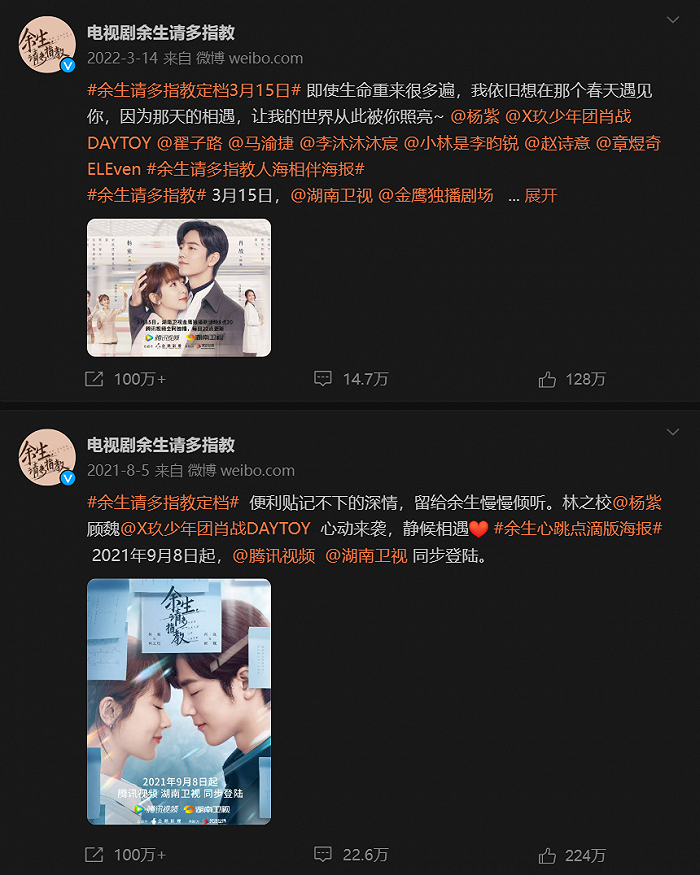 一種是楊紫和肖戰(zhàn)主演的都市言情劇《余生請(qǐng)多指教》,在2021年8月5日官宣定檔9月8日騰訊視頻與湖南衛(wèi)視同步播出,因?yàn)樘崆傲艘粋€(gè)多月,即使是官方微博宣布,很多人也“不敢相信”。當(dāng)然事實(shí)最后也證明了觀眾擔(dān)心的正確,該劇于9月5日官宣撤檔,半年后于2022年3月15日播出,僅提前一天官宣定檔。