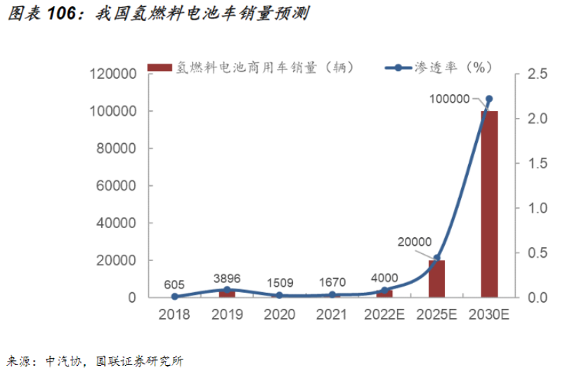根據(jù)《氫能產(chǎn)業(yè)中長(zhǎng)期發(fā)展規(guī)劃(2021-2035)》,到2025年國(guó)內(nèi)氫燃料電池車保有量達(dá)到5萬輛,對(duì)應(yīng)2025年銷量2萬輛左右。規(guī)?;?guó)產(chǎn)化推動(dòng)下,燃料電池成本有望快速下降,據(jù)國(guó)聯(lián)證券賀朝暉等人研報(bào)測(cè)算,預(yù)計(jì)到2030年國(guó)內(nèi)氫燃料電池車全生命周期成本將實(shí)現(xiàn)與柴油重卡平價(jià),經(jīng)濟(jì)性優(yōu)勢(shì)驅(qū)動(dòng)下,氫燃料電池車將持續(xù)放量,2030年產(chǎn)銷規(guī)模至少達(dá)到10萬輛水平。