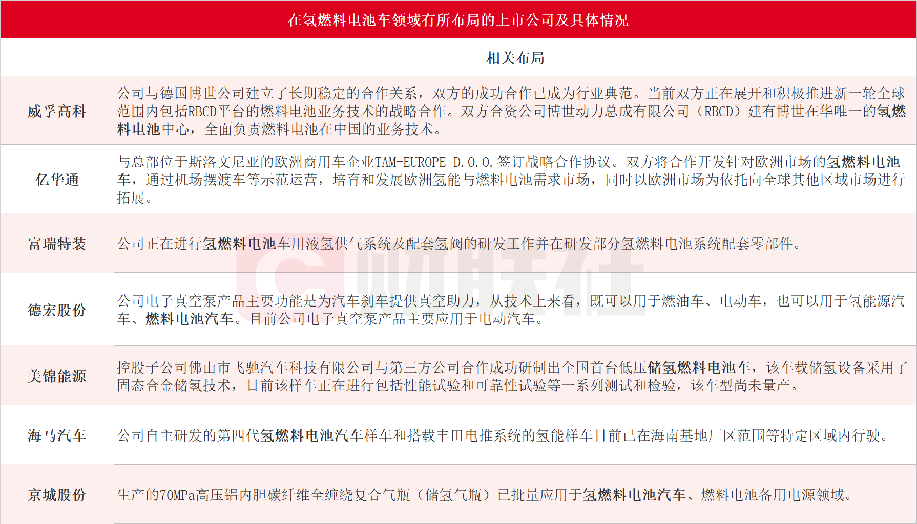 據(jù)財(cái)聯(lián)社不完全統(tǒng)計(jì),在氫燃料電池車領(lǐng)域有所布局的上市公司包括威孚高科、億華通、富瑞特裝、德宏股份、美錦能源、海馬汽車和京城股份等,具體如下: