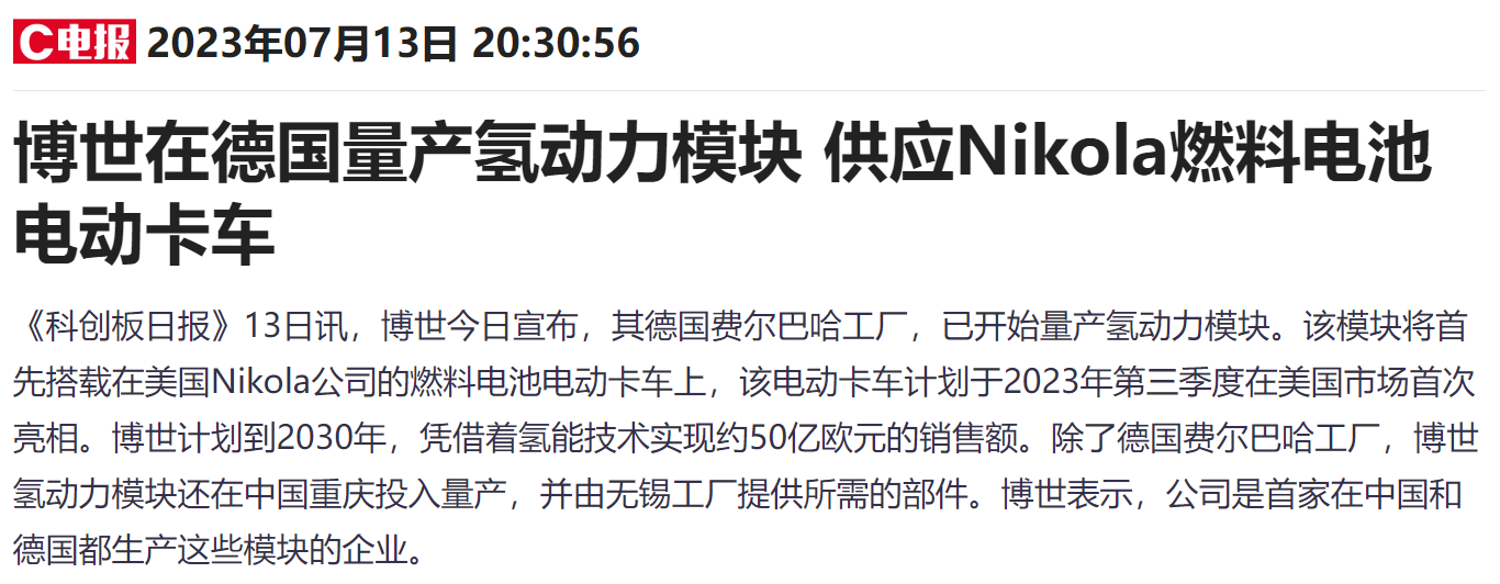 與此同時(shí),Nikola的電池供應(yīng)商博世宣布,其德國(guó)費(fèi)爾巴哈工廠已開始量產(chǎn)氫動(dòng)力模塊,該模塊將首先搭載在美國(guó)Nikola公司的燃料電池電動(dòng)卡車上,該電動(dòng)卡車計(jì)劃于2023年第三季度在美國(guó)市場(chǎng)首次亮相。博世計(jì)劃到2030年,憑借著氫能技術(shù)實(shí)現(xiàn)約50億歐元的銷售額。除了德國(guó)費(fèi)爾巴哈工廠,博世氫動(dòng)力模塊還在中國(guó)重慶投入量產(chǎn),并由無錫工廠提供所需的部件。博世表示,公司是首家在中國(guó)和德國(guó)都生產(chǎn)這些模塊的企業(yè)。