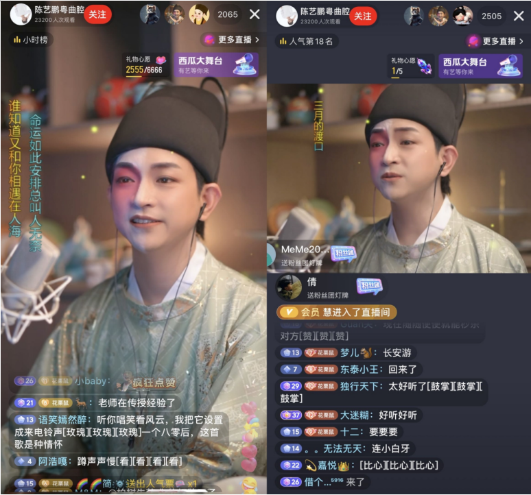 7月15日晚8點(diǎn),粵語(yǔ)粵曲文化推廣者、獨(dú)立音樂(lè)人陳藝鵬在西瓜視頻的直播準(zhǔn)時(shí)開(kāi)始了。只見(jiàn)他化著“一半戲曲妝、一半普通妝”的特殊妝容出現(xiàn)在“陳藝鵬粵曲腔”直播間,在兩小時(shí)的表演中,除為網(wǎng)友們表演《東坡戀》《是君否》《有緣無(wú)份》等原創(chuàng)粵語(yǔ)中國(guó)風(fēng)歌曲外,也翻唱了《親密愛(ài)人》《心太軟》《東風(fēng)破》等流行歌曲,用“一半人生一半戲,一半流行一半粵曲”的精彩表演吸引了超10萬(wàn)人次觀看。