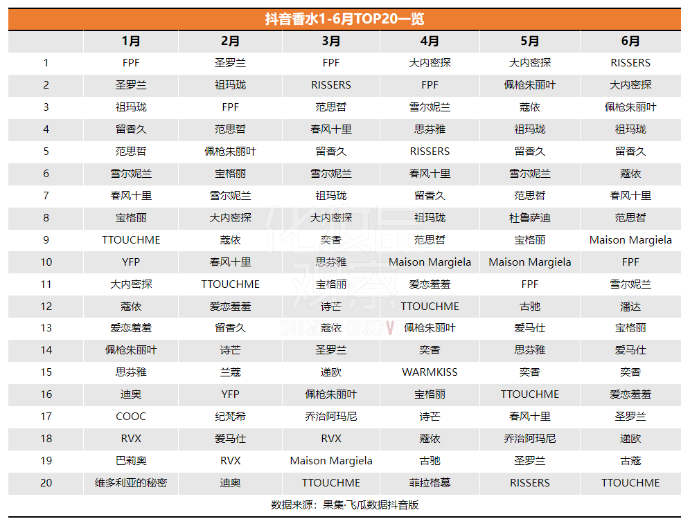 1、TOP1頻繁易主。相較于護膚、彩妝等品牌,香水TOP1頻繁易主,6個月內(nèi),共有4個品牌問鼎榜首,分別是FPF、圣羅蘭、大內(nèi)密探、RISSERS。