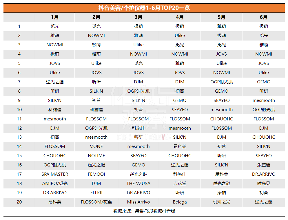 3、美容儀成大贏家。TOP20榜單中,共有4個美容儀品牌強勢入圍,包括極萌、覓光、雅萌、NOWMI,其中,極萌位列榜單TOP3。