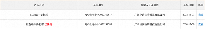 兩家公司也都在國藥監(jiān)局備案了“紅色蝸牛嬰初霜”產(chǎn)品,兩個備案中的產(chǎn)品、外觀、功效基本一致,此前中恒瀾生物的備案已經(jīng)被注銷,中浩生物的紅色蝸牛嬰初霜的備案也在7月13日被注銷。