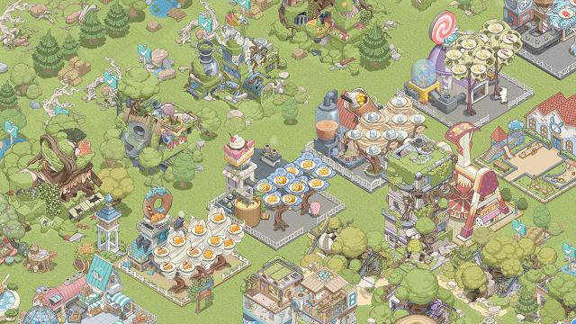 每個建筑的建模都十分用心,從外表便能識別出其用途,整體風格有種蒸汽朋克加童話森林的混搭風。像喵喵餐廳,外表像只橘貓趴坐在地上,背著一盤清蒸魚。動物小屋有的載著一池瀑布、外面的木制風扇又讓房子似乎可像天空之城啟航。面包廠的屋頂立著一塊巧克力甜甜圈,煙囪有節(jié)奏地吐出煙圈,甜點如士兵整齊運往樹梢烘培,小動物澆完水便來回踱步,甜點成熟后像蘋果一樣落在地上。