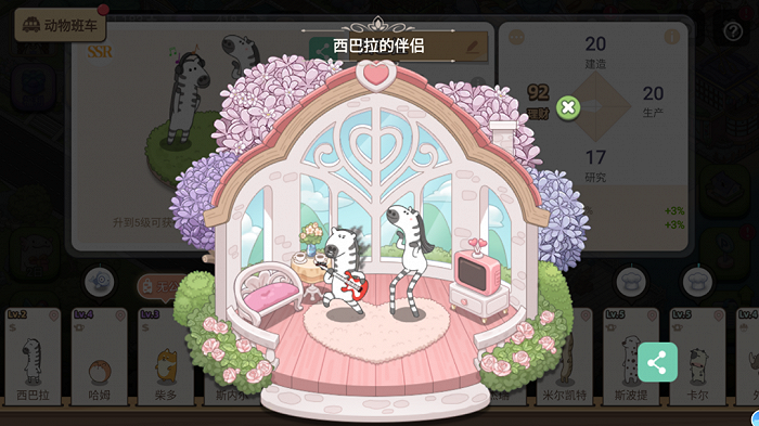 在無事時,玩家可以看見動物趴在各式各樣的建筑上休息,兔子瓦比特甩著大長腿懶洋洋地掛在秋千上,犀牛河馬一臉壞笑地坐在兔子雕像上發(fā)呆。而動物升級后還能解鎖伴侶,并獲得新技能。整體來說,初體驗確實能感受到解鎖更多裝飾物的快樂。不過細想,整個過程確實有些急于提升等級,解鎖新玩法。