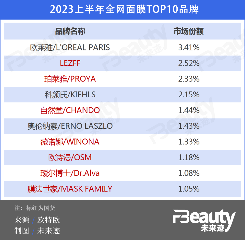 在今年上半年全網(wǎng)面膜TOP10品牌中,國貨與外資品牌占比為7:3,外資品牌有歐萊雅、科顏氏和奧倫納素進(jìn)入榜單,其中,歐萊雅以3.41%的市場份額占據(jù)品牌榜首位,且獲得41.43%的同比增長率,國貨新銳品牌LEZFF以517351.44%的大幅銷售額同比增長率,占據(jù)3.41%的市場份額,位于品牌榜第二。