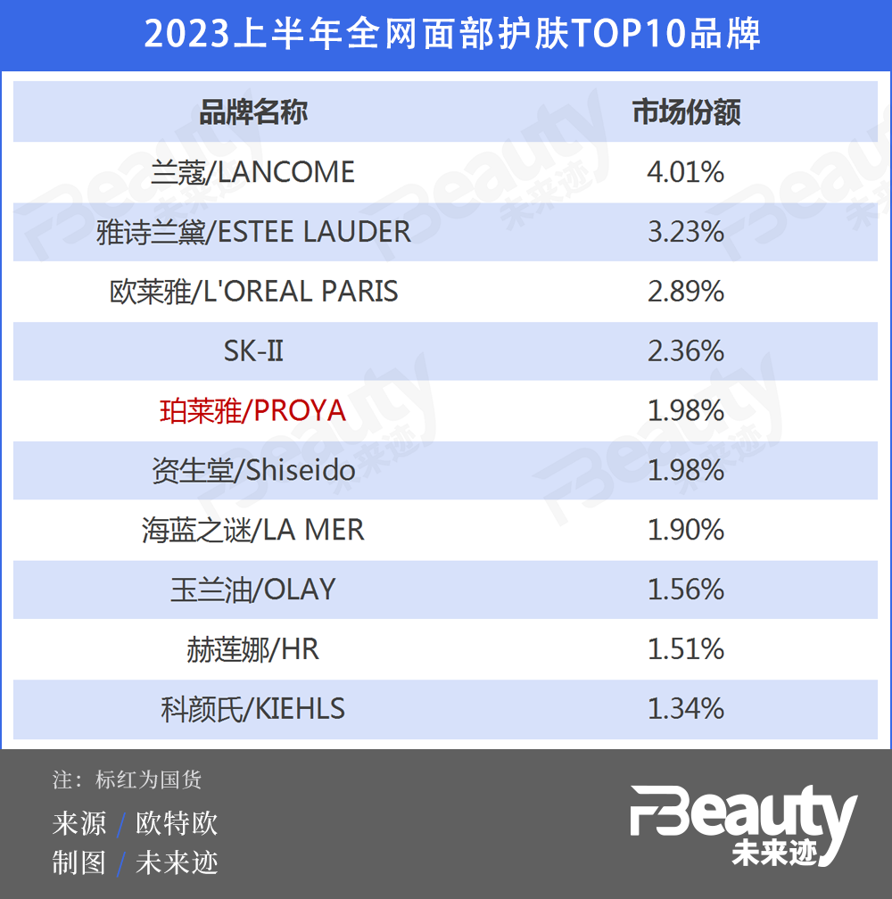作為國內(nèi)化妝品最大的細(xì)分市場,僅有珀萊雅這一個國貨品牌進(jìn)入品牌榜前十,其以31.88%的同比增長率,獲得1.98%的市場份額。此外,面部護(hù)膚TOP10品牌榜中的所有品牌銷售額均錄得同比增長,蘭蔻更是以23.85%的銷售額同比增長率,摘得4.01%,其次為雅詩蘭黛市場份額3.23%、巴黎歐萊雅市場份額2.89%。