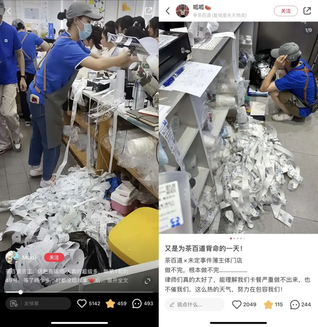 正如文章開頭的照片,聯(lián)名上線后,多地的茶百道門店陷入了極端的爆單狀態(tài),不得不全員出動,不僅打電話讓休息的員工也回來上班,甚至有的店還要去隔壁借店員。