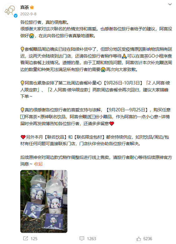 去年9月6號上線的喜茶x原神聯(lián)名,則因為聯(lián)動期長達(dá)一個月,但部分門店物料第一天就售罄,且聯(lián)名亞克力立牌聯(lián)名期內(nèi)不補(bǔ)貨而被玩家吐槽“我就是沖著立牌去的,沒有立牌我買什么奶茶?”“又一個不知道原神玩家量級的聯(lián)動方……原神都聯(lián)動好多次了,自己不做好市場調(diào)研嗎?”聯(lián)名杯子物料也因為輕擦就會掉色,無法正常使用而被吐槽。9月8號,喜茶官方道歉,稱贈品周邊將陸續(xù)補(bǔ)貨,但由于工期和物流問題,估計補(bǔ)充的周邊數(shù)量和種類無法滿足所有旅者(原神玩家)的需要。