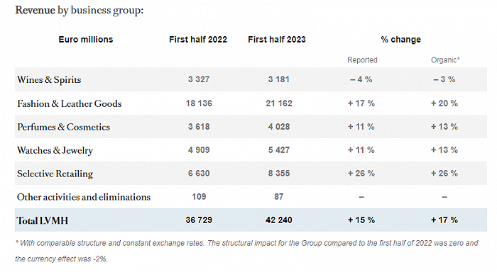 財報顯示,LVMH在2023年上半年的收入為422億歐元(約合人民幣3342.28億元),同比增長15%;有機收入增長了17%,與第一季度的增長趨勢一致。