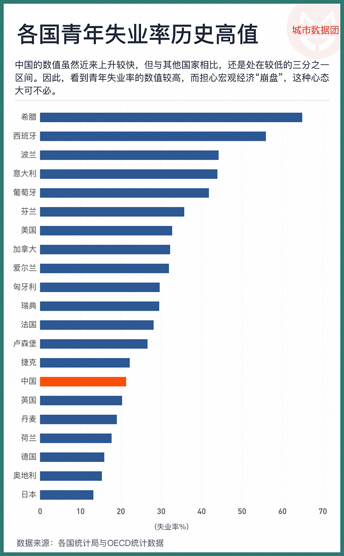 而在這些新聞中可以看到,韓國青年失業(yè)率雖然創(chuàng)新高,但也只有10.7%左右,而澳大利亞的青年失業(yè)率一度達到過27.1%;部分歐盟國家的青年失業(yè)率則非常之高,希臘和西班牙甚至達到過50%以上。可見這個指標在不同國家之間的差異也相當大。