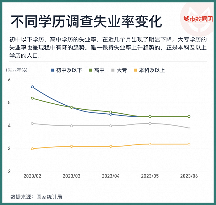 再看學歷,上表呈現(xiàn)了四類學歷人口從2023年2月到6月的失業(yè)率變化。不難發(fā)現(xiàn),初中以下學歷、高中學歷的失業(yè)率,在近幾個月出現(xiàn)了明顯下降。大專學歷的失業(yè)率也呈現(xiàn)穩(wěn)中有降的趨勢。唯一保持失業(yè)率上升趨勢的,正是本科及以上學歷的人口。