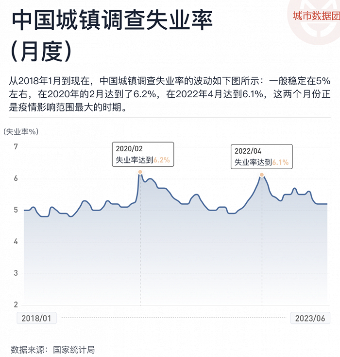 從2018年1月到現(xiàn)在,中國城鎮(zhèn)調(diào)查失業(yè)率的波動如下圖所示:一般穩(wěn)定在5%左右,在2020年的2月達到了6.2%,在2022年4月達到6.1%,這兩個月份正是疫情影響范圍最大的時期。