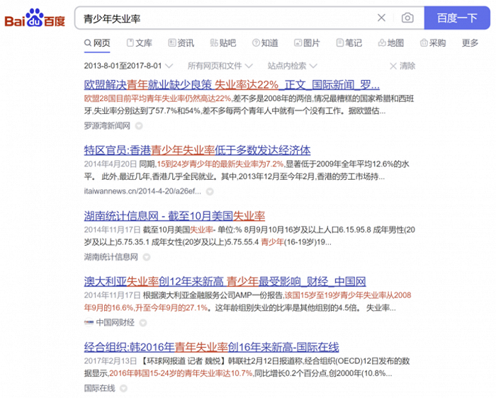 雖然青年失業(yè)率在我國還算一個新指標,但卻早已出現(xiàn)在各類“國外水深火熱”的新聞中了。從百度搜索2013年到2017年的新聞,可以看到這樣一系列結(jié)果,分析各國的青年失業(yè)率為何如此之高。