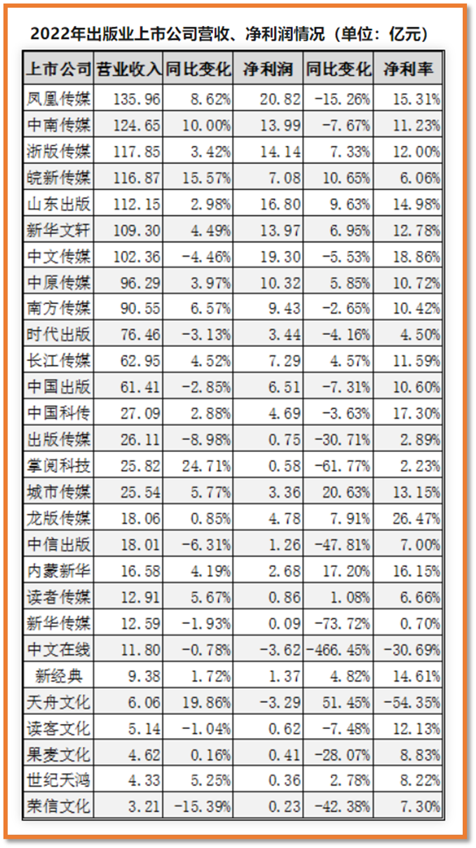 從2022年28家在A股上市的出版企業(yè)財報來看該行業(yè)的特征,就是營收規(guī)??赡芎艽?,但凈利潤表現(xiàn)中位數(shù)多數(shù)在10%上下,不算高,賺的是辛苦錢。