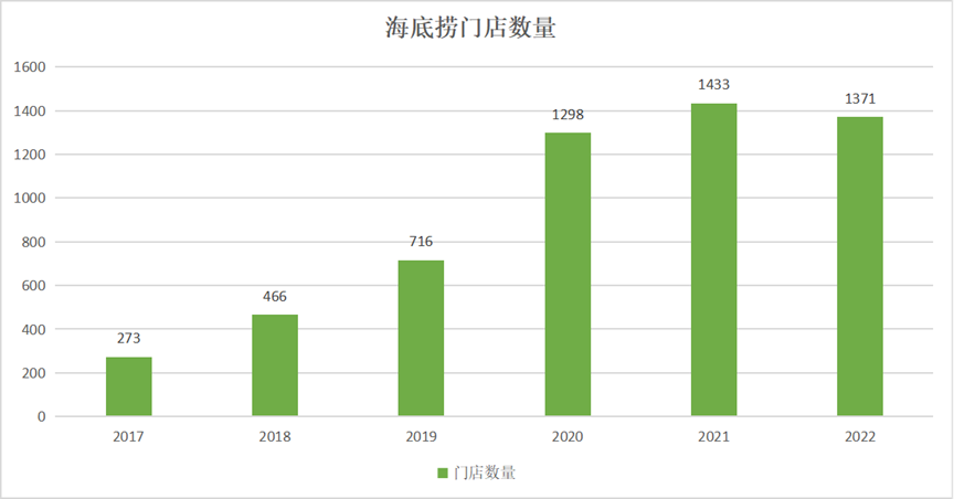 海底撈股價飆升的2020年和2021年,也是其門店數(shù)量增長最快的時期,從2019年的716家門店,增長至2021年關(guān)店之前的1597家。