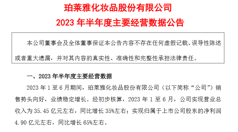 近日,珀萊雅發(fā)布了2023年上半年業(yè)績 報告,經(jīng)初步核算,2023年1至6月,珀萊雅實(shí)現(xiàn)營業(yè)總收入35.45億元左右,同比增長35%左右;實(shí)現(xiàn)歸屬于上市公司股東的凈利潤4.90億元左右,同比增長65%左右。