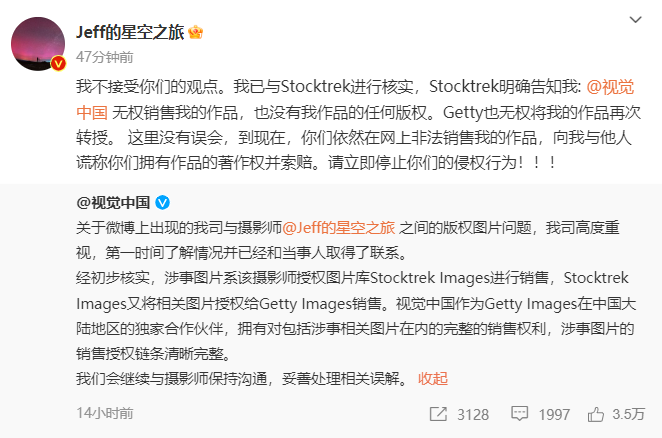 昨日晚間,視覺中國發(fā)布消息稱,關(guān)于微博上出現(xiàn)的視覺中國與攝影師“Jeff的星空之旅”之間的版權(quán)圖片問題,公司高度重視,第一時(shí)間了解情況并已經(jīng)和當(dāng)事人取得了聯(lián)系。經(jīng)初步核實(shí),涉事圖片系該攝影師授權(quán)圖片庫Stocktrek Images進(jìn)行銷售,Stocktrek Images又將相關(guān)圖片授權(quán)給Getty Images銷售。視覺中國作為Getty Images在中國大陸地區(qū)的獨(dú)家合作伙伴,擁有對包括涉事相關(guān)圖片在內(nèi)的完整的銷售權(quán)利,涉事圖片的銷售授權(quán)鏈條清晰完整。我們會繼續(xù)與攝影師保持溝通,妥善處理相關(guān)誤解。